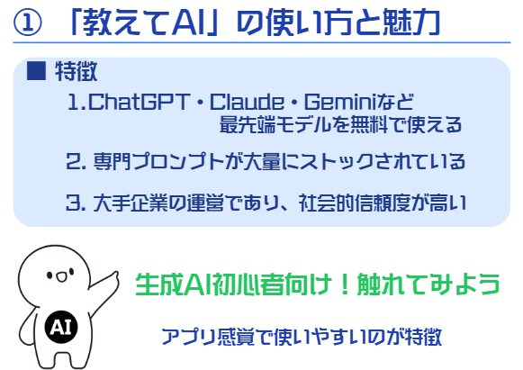 「教えてAI」は、生成AI初心者でも簡単に使えるツールで、ChatGPT、Claude、Geminiなど最先端モデルを無料で活用できます。